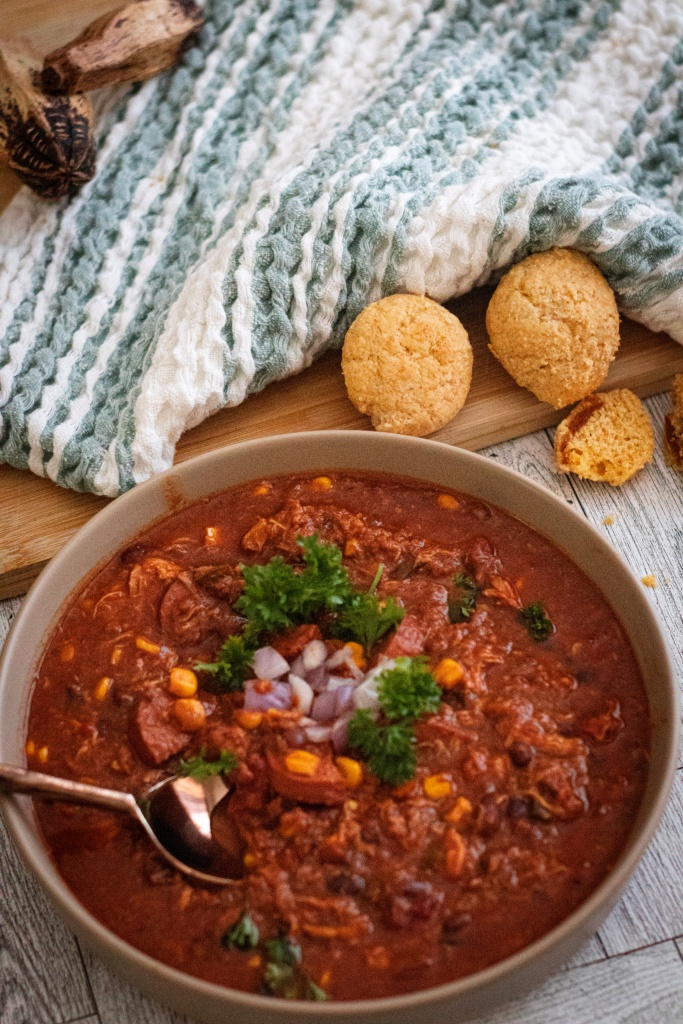 When I first made this chili, I was thinking I wanted something cozy yet hearty and also non-traditional. So I picked up a rotisserie chicken and some smoked sausage, and the rest just came together from pantry staples. The result was a rich, flavorful chili that’s both meaty and comforting, with just the right kick from the Rotel and chili seasoning.